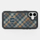 Contemporary dark teal blue, tan, brown, beige, taupe, and ivory cream white tartan plaid pattern. With room to customize or personalize with a monogram or initial of your choice. Beautiful, modern, and cool cover for the trend-savvy and art-loving hip trendsetter, artsy motif lover who wants to protect their phone from dust and dirt, wear and tear. This design is available in Apple iPhone 6, 7, and 8 Plus, 10 or X, XR, XS, 11, 12, 13 Mini, 14, 15 Plus, and Pro Max cellphone cases. Show off your style, look fashionable trendy, and feel stylish with a unique design on a mobile device accessory of your choice.