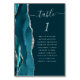 The left-hand edge of this elegant modern wedding table number card features a teal blue watercolor agate border trimmed with faux silver glitter. The word "table" appears in silver gray handwriting script on a dark teal blue background. Add the names of your guests who are assigned to each table.