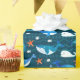 Adorable three types of whale illustrations on a dark teal, tribal hawaiian pattern background. Tiny, orange, starfish within pattern.
