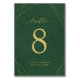 A stylish seating table card featuring a rich dark turquoise background accented with sleek gold lines —