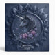 Dark Unicorn Portrait in a Round Frame – Magical Fantasy Artwork with Roses & Hearts. This artistic unicorn portrait depicts a magical, dark unicorn with a silver horn, surrounded by delicate purple and pink roses. Small purple hearts float dreamily around the majestic mythical creature. The round frame is decorated with dark blue flowers and leaves, giving the motif a romantic, mystical feel. The soft blue background emphasizes the dreamy and fairytale-like mood of the artwork. Perfect for fantasy fans, romantics, and anyone who loves magical unicorn art.