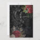 Ornate engraved scrollwork, silver lace, burgandy roses and french script on shabby black damask background.