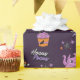 This magical Halloween wrapping paper features a dark violet background with adorable illustrations, including a witchy white cat on a broom, spooky cupcakes, a pink octopus, and playful “Hocus Pocus” lettering. The whimsical design filled with stars and charming details makes it perfect for wrapping Halloween gifts and party favors with a fun, enchanting vibe.