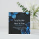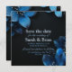Dark wedding save the date with blue flowers and glitters.