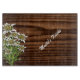 Lovely glass cutting board done in a dark stained wood grain look, with graphics of edelweiss flowers, on the left side. Personalize the white script text to suit your needs.