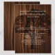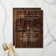 Large wedding table menu done in a dark wood look, with dark deep looking grain. Graphics of of a tree silhouette in a darker wood tone, decorates the middle of the menu. Text in a creamy ivory is ready to personalize for your wedding reception.