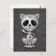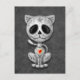 This adorable grey kitten design is decorated with swirls and dot patterns. Small flower pedals circle the pure black eyes in the tradition of the Day of the Dead sugar skulls. The cat is sitting down, looking forward with its tail waving in the background. The over sized head sits on a tiny body which creates a playful, cartoon like appearance. A five point star sits in the middle of the kitten’s forehead while a bright red and yellow heart appears in the center of the chest. This cute little cat is a fun and stylish design inspired by the beautiful patterns of Day of the Dead sugar skulls.