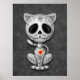 This adorable grey kitten design is decorated with swirls and dot patterns. Small flower pedals circle the pure black eyes in the tradition of the Day of the Dead sugar skulls. The cat is sitting down, looking forward with its tail waving in the background. The over sized head sits on a tiny body which creates a playful, cartoon like appearance. A five point star sits in the middle of the kitten’s forehead while a bright red and yellow heart appears in the center of the chest. This cute little cat is a fun and stylish design inspired by the beautiful patterns of Day of the Dead sugar skulls.