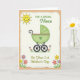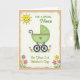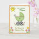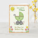 This greeting card features a sweet, stylized baby carriage in soft green with a pink rim and a small green heart, giving the scene a gentle, affectionate tone ❤️. The carriage sits centered inside a dashed border on a creamy background, with sturdy black wheels and visible spokes that make it feel grounded and steady. A bright yellow sun with a simple smiling face and short rays glows in the upper left, like a friendly witness to a new beginning 🌼. A light tan outer frame surrounds the inner panel, adding a quiet layered look without distracting from the main illustration. The message text appears above and around the carriage in flowing letterforms, with some words in green and others in yellow for a soft, sunny contrast. Along the lower edge and up the sides, small flower clusters in pink, yellow, and purple rise on thin green stems, as if they’re leaning in close like supportive friends. The curved handle and the little heart detail add a tender, romantic touch, like a caring hand guiding the moment forward. The tiny blooms are arranged near the bottom corners and side margins, with petals in soft pink, buttery yellow, and light purple against the cream panel.