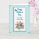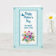 Designed with a tall, centered layout, this card features a bright white rectangular panel that draws the eye and feels softly affectionate ❤️. Near the top of the panel, a flowing teal message is placed in large lettering, with a small bird silhouette nearby as if it’s hovering close in a tender, companionable moment. Beneath the words, a lush bouquet of stylized flowers gathers tightly together, like a friendly offering held out with care. Pink, purple, yellow, and sky-blue blossoms mix with fresh green leaves, and a cool-toned bloom with butterfly-like wings adds a gentle touch 🌼. The white panel is framed by a scalloped light-blue border, followed by a thin deeper-teal outline that sharpens the edge. Behind it all sits a calm light-cerulean background with a faint grid texture that resembles woven fabric. Along the outer perimeter, fine dashed lines suggest stitching, and small swirling corner ornaments curl in a soft light-blue tone.