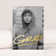 Modern graduation announcement featuring the graduate's vertical photo with "Grad" in real gold foil handwritten lettering with a dash below. Personalize the trendy photo graduation announcement by adding the graduate's name and school name. The gold foil graduation announcement reverses to display a pattern of black and white dashed brushstrokes.