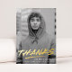 Modern graduation thank you card featuring the graduate's vertical photo with "Thanks" in real gold foil handwritten lettering with a dash below. Personalize the trendy photo graduation thank you card by adding the graduate's name and school name. The gold foil graduation thank you card reverses to display your typed or handwritten message with a background of black and white dashed brushstrokes.
