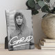 Celebrate your graduate's achievement with a personalized graduation photo keepsake. The plaque features the graduate's vertical photo with "Grad" in white handwritten lettering with a dash below. Personalize the graduation photo plaque by adding the graduate's name, school, and graduation year.