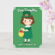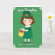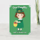 This card shows a sweet cartoon girl smiling with rosy cheeks against an emerald green background, giving the scene a cozy, affectionate feel 💚. She wears a deep green leprechaun hat with a golden buckle and a matching green dress trimmed with a white Peter Pan collar and dashed detailing. In her small hands she carries a sunny yellow basket dotted with red and pink touches, like little blooms or shamrock-shaped treats that feel like a friendly gift meant for someone special ☘️. White daisy shapes decorate the corners, softly framing her as if she’s standing in a simple springtime setting. At the top, the words “Dear Daughter” sit centered in white lettering, standing out clearly against the green. Along the bottom, “HAPPY ST. PATRICK’S DAY” stretches across in larger, capital letters, also in white, to balance the picture. The lighting stays flat and bright, keeping every color crisp, from the gold buckle to the tiny pink-red accents in the basket. The front design shows the girl centered on the page with daisies in each corner and the greeting text placed at the top and bottom over the green field.