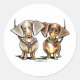 Two piebald dappled Dachshunds sporting stylish heart collar and pink camouflage harness. Original illustration by Andie of Off-Leash Art.
