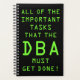 This fun DBA themed planner features the message "ALL OF THE IMPORTANT TASKS THAT THE DBA MUST GET DONE!" on the front in a bright green color digital-inspired font. It could be a fun gift for a busy professional database administrator who has lots of tasks to deal with.