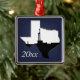 Dated ornament with an oil drilling rig, in silhouette, in the center of the shape of the state of Texas.