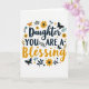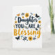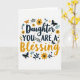 Designed with a bright white background, this card features a centered message that reads “Daughter YOU ARE A Blessing” with a warm, affectionate look ❤️. “Daughter” sits near the top in flowing navy lettering, while “YOU ARE A” is placed beneath it in a more structured navy style that feels steady and supportive. “Blessing” anchors the lower portion in golden yellow lettering, giving the layout a sunny, caring balance. Around the words, golden yellow daisies with deep blue centers and teal-green leaves create a garden setting that feels like a gentle hug. Soft amber and deep blue butterflies drift between the lines of text, as if drawn toward the message and each other. Small orange dots are sprinkled across the space, adding light texture without crowding the design 🌼. The daisies and butterflies are scattered around the text, with leaves in both teal and darker olive tones filling the corners.