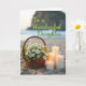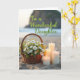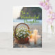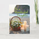 This card shows a softly blurred seaside background where rippled sand leads the eye toward a calm ocean and a hazy horizon. In the foreground, a rustic woven basket sits slightly left of center, brimming with white and yellow daisy-like wildflowers and leafy green stems, as if set down by someone with a gentle, caring touch ❤️. To the right of the basket, four smooth pillar candles in staggered heights glow in warm amber, their small flames leaning as though sharing a quiet moment together. The warm light from the candles pools across the sand’s textured ridges, adding a cozy, close-to-you feel against the open shoreline. Near the upper middle, the phrase “To a Wonderful Daughter” appears in flowing, cursive-style lettering in a soft, dark tone that stands out without overpowering the scene. Farther back, faint land shapes rise along the waterline, giving the view a distant, dreamy depth 🌼. The flowers show creamy white petals with sunny yellow centers, and the candles cast gentle highlights along their edges.
