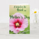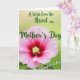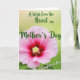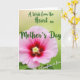 This card features a large, delicate pink flower filling the lower half, with wide petals that fade from soft blush at the edges into a deep magenta center ❤️. Near the middle, a small cluster of pale yellow-green stamens glows against the darker tones, adding a gentle focal point. Fine veins and slight ripples across the petals give the bloom a tender, touchable texture, like a quiet gesture of care. Behind it, the background is a softly blurred green wash that suggests a calm garden setting warmed by daylight 🌼. Across the upper area, the main message appears in flowing, decorative lettering in a rich forest green, curving in an arc above the flower. A smaller line of text sits in the lower right in the same green, placed like a private note meant for someone close. The overall layout leaves open breathing room around the words, while the flower’s magenta heart remains centered beneath the arched title. The petals spread outward with gentle undulations, and the green lettering floats above them against the misty green backdrop.