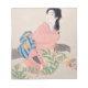 This design features an image of a silk painting by female Japanese artist Uemura Shoen (上村 松園, 1875–1949). The artist is particularly famous for her depictions of beautiful women in the nihonga (日本画) style, although she also produced many works on historical themes and traditional subjects. She received many awards and other forms of recognition during her lifetime, being the first female recipient of the Japanese Order of Culture (文化勲章); she was also hired as the Imperial Household's official artist, which had previously only employed one other official woman in the position. The painting shown here is in the bijinga (美人画) style, which is a general term for pictures of beautiful women in Japanese art, especially in woodblock printing of the ukiyo-e genre. It shows Akizuki Miyuki, a character from a classical joruri (浄瑠璃) drama, which is a traditional form of storytelling accompanied by music. The original artwork (娘深雪) was completed in 1914.