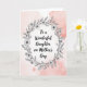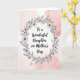 This card features a soft blush-pink, watercolor-like background that feels gentle and affectionate, like a quiet hug ❤️. In the center, a floral wreath drawn in fine black linework wraps around the main message, with daisy-like blooms, slim branches, and small leaves creating a tender, gathered-together look. The lettering sits neatly inside the wreath, with the main line reading “To a Wonderful Daughter on Mother’s Day” in black, standing out clearly against the pale wash. The text is centered and sized to be the focal point, while the flowers act like a delicate embrace around it. The monochrome botanicals add a calm, intimate mood, as if the blooms were picked with care and arranged for someone special 🌼. Subtle variations in the pink background fade at the edges, giving the space a soft, airy depth without distracting from the message. The wreath is evenly rounded, with clustered petals and leaf sprigs repeating around the circle in a balanced, sketch-like style. The final detail is the thin black outline of the daisy petals and leaves forming a complete ring around the centered text.