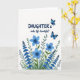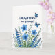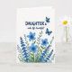 This greeting card features a bright white background with a dark blue headline near the top that reads “DAUGHTER’S make life beautiful!” in a strong, easy-to-read style. The first word is larger and heavier, while the rest shifts into a softer, flowing look, like a gentle voice following a confident statement. Below the text, a garden-like border of stylized blue flowers spreads across the lower area, with petals ranging from deep navy to light sky blue that feel softly brushed. Green leaves and thin stems weave between the blossoms, creating a cozy, caring scene that hints at closeness and affection ❤️. The message sits centered above the floral cluster, leaving airy space around it so the words stand out without crowding the art. Two small blue butterflies hover near the upper right, adding a light, friendly touch as if they’re drifting toward the lettering 🌼. The butterflies have delicate outlines and patterned wings in shades of blue, floating against the open white space near the top corner.