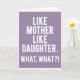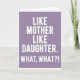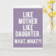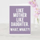 This card features a soft lavender‑purple background with large white letters that fill most of the front. The message reads “LIKE MOTHER LIKE DAUGHTER. WHAT, WHAT?!” laid out in three stacked lines, giving it a confident, chatty rhythm that feels like an inside joke between two close people ❤️. The lettering is thick and easy to read, with a faint shadow around each character so the words seem to sit slightly above the surface. The punctuation—period, comma, and the paired question mark and exclamation point—adds a teasing back‑and‑forth tone, like a daughter echoing her mom with a grin. The text is centered both left‑to‑right and top‑to‑bottom, leaving even breathing room around the edges. A thin, pale border frames the design and keeps the focus on the bright white message 🌼. The overall look stays minimal, with the lavender field uninterrupted except for the centered text and that narrow border.