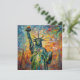 The postcard features a vibrant, swirling reinterpretation of the Statue of Liberty in Vincent van Gogh’s iconic style. The statue stands tall against a dynamic, expressive sky—thick, swirling brushstrokes in shades of cobalt blue, golden yellow, and fiery orange. Lady Liberty’s torch burns brightly, the flames alive with movement. In the distance, the faint outline of the city skyline emerges from the textured strokes, blending dreamlike optimism with bold determination.