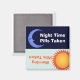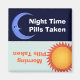 Colorful square magnet made as a medication reminder. The magnet is done half in dark blue and half in light aqua blue, with a moon on the dark side and a sun on the opposite side. White text on the moon side reads Night Time Pills Taken, and flip it over and it reads, Morning Pills Taken, on the sun side of the magnet. Makes it a lot easier to remember if you took your meds and a great little gift for older seniors who tend to forget.