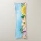 Snuggle worthy body pillow graced w/a gorgeous watercolor floral border against a starlit night sky on one side and a glorious blue sky w/ fluffy white clouds on the back. By digital artist, Leslie Sigal Javorek.