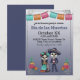 This custom Dia de los Muertos celebration invitation features a colorful illustrated design. An image of a skeleton couple and a cat printed in a sugar skull pattern are placed at the bottom. Beautiful colorful flowers are printed on either side of the Day of the Dead couple and their cat. A papal picado hangs across the top.