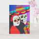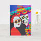 Day of the Dead Greetings from Both of Us, Dia de los Muertos, paper greeting card with a skeleton couple in bright colorful clothing and painted faces. Art, image, and verse copyright © Shoaff Ballanger Studios, 2023.