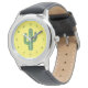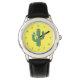 This awesome watch features a digital art image of a cute green cactus covered in dark green spiky prickles. The cactus has goofy eyes and a smile on its face.