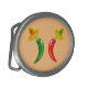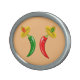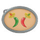 This awesome belt buckle features a pair of chilis, a red chili and a green chili. They both have black eyes and pink mouths. Each Chili is wearing a sombrero hat that has a skull of the opposite color to the chili on it in celebration of the Mexican Day of the Dead festival, Dia De Los Muertos. The sombrero also contains three flowers with alternating red and green petals representing the flag of Mexico.