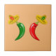 This awesome tile features a pair of chilis, a red chili and a green chili. They both have black eyes and pink mouths. Each Chili is wearing a sombrero hat that has a skull of the opposite color to the chili on it in celebration of the Mexican Day of the Dead festival, Dia De Los Muertos. The sombrero also contains three flowers with alternating red and green petals representing the flag of Mexico.