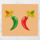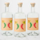 This awesome sheet of liquor bottle labels features a pair of chilis, a red chili and a green chili. They both have black eyes and pink mouths. Each Chili is wearing a sombrero hat that has a skull of the opposite color to the chili on it in celebration of the Mexican Day of the Dead festival, Dia De Los Muertos. The sombrero also contains three flowers with alternating red and green petals representing the flag of Mexico.