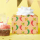 This awesome patterned wrapping paper features a pair of chilis, a red chili and a green chili. They both have black eyes and pink mouths. Each Chili is wearing a sombrero hat that has a skull of the opposite color to the chili on it in celebration of the Mexican Day of the Dead festival, Dia De Los Muertos. The sombrero also contains three flowers with alternating red and green petals representing the flag of Mexico.