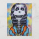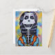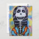 This happy and smiling Day of the Dead skeleton is from my original color pencil drawing. This skeleton is dressed for her Day of the Dead celebration in a brightly colored shawl of orange and blue and is holding white flowers. The background has a watercolor appearance with yellows, pinks and blues. See my store Art by MAR for more products with this image.