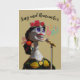 Dia de los Muertos, Day of the Dead greeting card with a paper mache female skeleton figure at a microphone singing. She is adorned with red roses, a marigold ribbon and bow, and gold accented dress. Cover message "Sing and Remember". Art, image, and verse copyright © Shoaff Ballanger Studios, 2022.