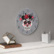Day of the Dead sugar skulls with roses on a gray background with a leaf border.