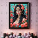 The vibrant turquoise background makes the coral florals and teal butterflies pop, while the hyper-detailed jeweled makeup and golden accents give the piece a luxurious finish. Ideal for Día de los Muertos celebrations, weddings, birthdays, or boho-chic décor projects.
