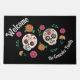 This custom welcome mat has a colorful Dia de los Muertos or Day or the Dead theme on a black background. Two sugar skulls are accented with pink and orange flowers, and floral greenery. A sample family name is printed under the skulls that you can personalize to include your own custom name or text.