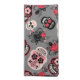 Day of the Dead white and black sugar skulls with roses on a gray background.