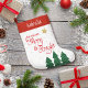 “May your days be merry & bright.” A playful illustration of a red script typography quote and green trees against a gold glitter star background, with a personalized name in the red band, helps you usher in Christmas and New Year. Feel the warmth and joy of the holiday season whenever you hang up this stylish and modern personalized name stocking. Your choice of small or large size. Matching and coordinating cards, envelopes, stickers, giftwrap, pillows and other products are also available. Give this to someone special!
