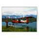 A bush pilot stands near his de Havilland Canada DHC-2 Beaver floatplane on the shore of a lake in the far north; mountains and trees are in the distance. This image was derived, in part, from a US Fish and Wildlife Service photo.