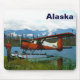 A bush pilot stands near his de Havilland Canada DHC-2 Beaver floatplane on the shore of a lake in the far north; mountains and trees are in the distance. Text reading "Alaska" also appears. This image was derived, in part, from a US Fish and Wildlife Service photo.