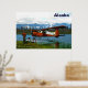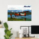 A bush pilot stands near his de Havilland Canada DHC-2 Beaver floatplane on the shore of a lake in the far north; mountains and trees are in the distance. Text reading "Alaska" also appears. This image was derived, in part, from a US Fish and Wildlife Service photo.