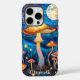 This captivating phone case features a mystical forest scene centered around a large, golden-orange capped mushroom, labeled as Deadly Webcap, set against a deep blue, wave-patterned night sky with a prominent full moon and sparkling stars. Smaller, glowing mushrooms and intricate flora emerge from the dark blue ground, enhancing the enchanting atmosphere. The design is personalized at the bottom with the name "Elizabeth."