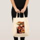 The printing came out very well, better than I had anticipated. The natural color fabric is sturdy with strong seams and comfortable handles. This tote fits easily over my shoulder. As it is filled, the bottom flattens out--very cool! I would buy this product again. This grocery tote holds a lot of groceries! The image quality was very good. The colors were a little darker than I had expected. The darkness may have been due to printing on a natural color fabric rather than on white. The cat design is attractively centered on the tote. The spirit of the design is very lively, just as it appears on the Zazzle website.